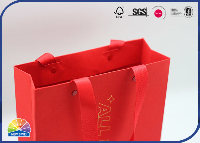 Bright Red Color Paper Gift Bag for Holiday Gifts Packaging with Gold Stamping Custom Logo