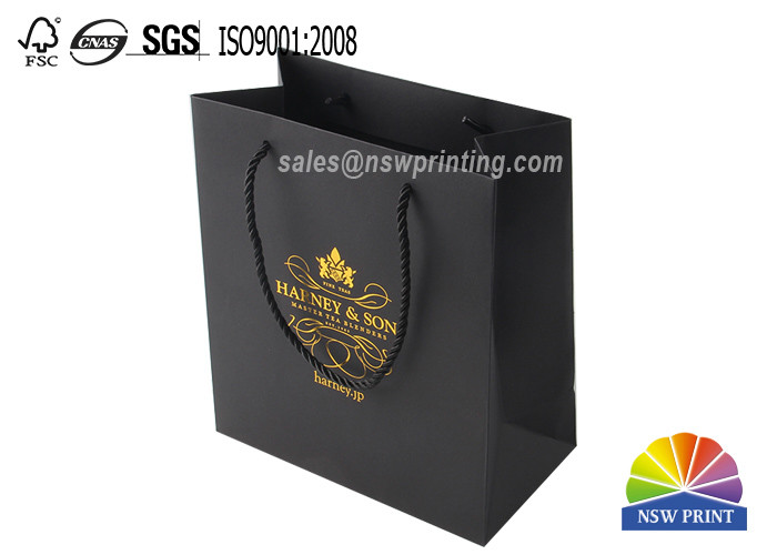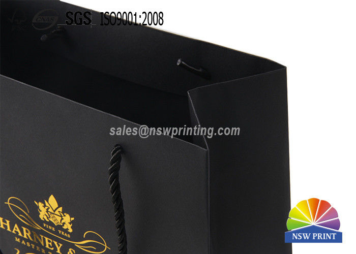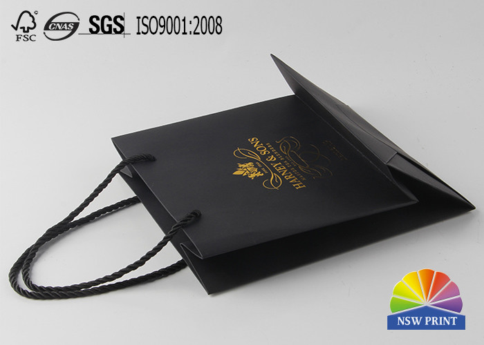 Durable Black Cardboard Custom Paper Bags with Brand Monogram Gold Foil Stamping